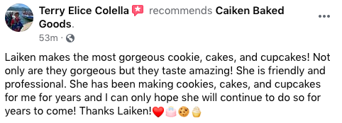 So my Mom suggested combining my talent for decorating and baking into a business venture. I was hesitant at first but so glad I jumped into the world of entrepreneurship! I have learned so much running my own business - everyday is different and EXCITING!!!